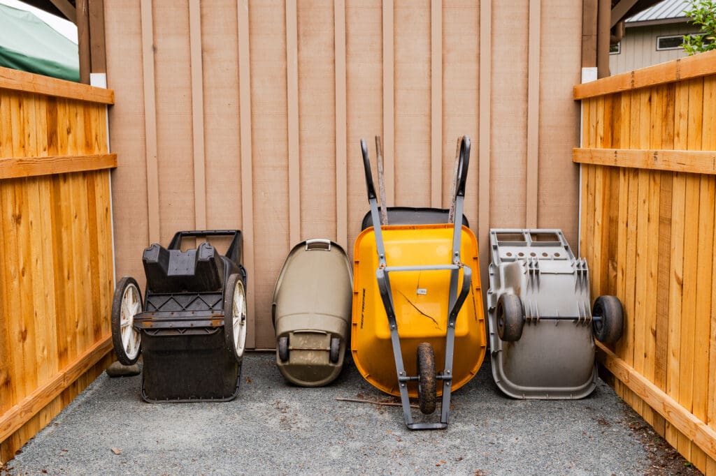 A composting station allows volunteers to process plant matter into rich organic matter perfect for feeding plants naturally.