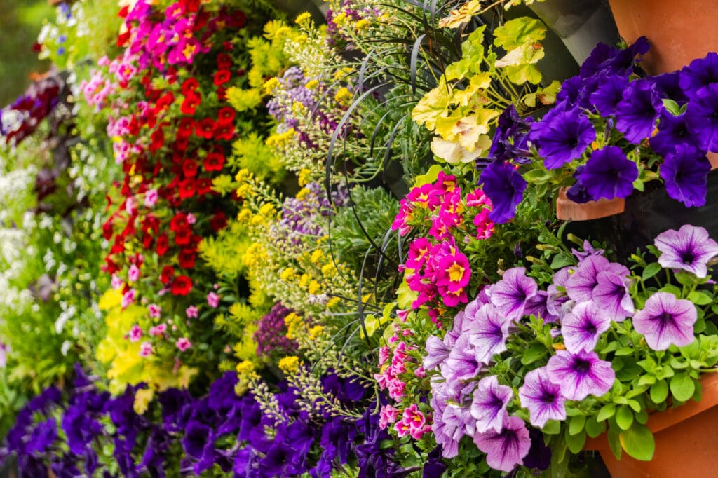 The photos above show just a few of the many plants growing in the garden, including tomatoes, raspberries, heuchera, petunias, dahlias, and succulents.