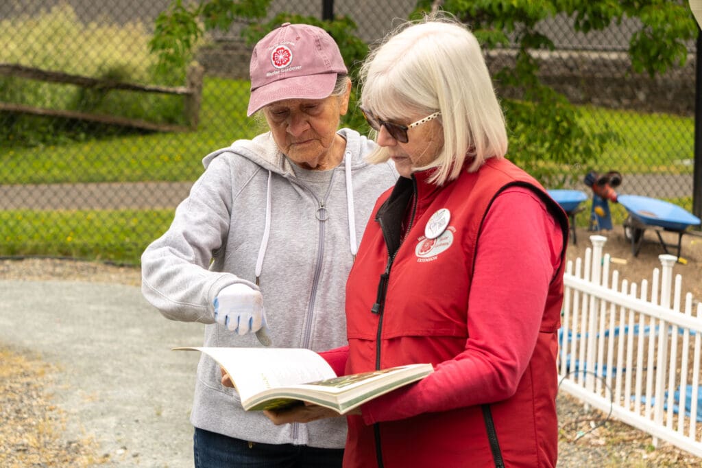 At a picnic bench in front of the central shed, a volunteer thumbs through a reference book, looking for insights about a visitor’s gardening concerns. Another volunteer helps young visitors fill produce bags with freshly picked carrots. Some of these scenes are pictured in the photos below.